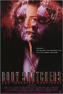 I will say I like the title sequence, where the letters in BODY SNATCHERS are overwhelmed by shadowy duplicates and it's hard to discern them after they've been absorbed--they're still there, but not the same. And I noticed the name "Billy Wirth" in the credits; I remember watching him as a contestant on American Gladiators back when that particular piece of cultural garbage was a going concern. (Note to younger readers: Some times game shows could be amazing.)